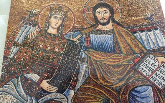 The contemplative consciousness of the days made me more attentive and open to being surprised during and outside of meetings. An amazing surprise one evening was the discovery of an ancient mosaic above the altar in the 12th-century Basilica of Santa Maria in Trastevere: Mary and Jesus, both with crowns, seated on thrones side by side in an intimacy that is captivating. Jesus has his arm tenderly circling Mary's shoulders, and she, with hands in her lap, is pointing to Jesus.