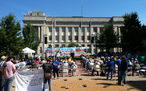 Isn't it amazing how great the weather has been every place Nuns on the Bus stops? We're struck by the brilliant autumn skies showing up in these photos coming from the road. Get inspired to help get out the vote in your own community by reading what Sr. Jean Ann Zappa, OSU, describes as a Rousing Rally that happened yesterday when they were in Lexington, Kentucky. This courthouse-steps appearance rivals the kick-off in Des Moines, Iowa, with more than 200 supporters and four television news crews!