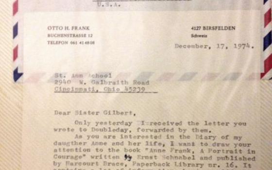 So that's exactly what I did. I wrote to the publisher, Doubleday, and because I didn't hear anything very soon I promptly forgot about it and went on to other things. But then on December 17, 1974, I received an air mail letter on thin onion-skin stationery. The letter was addressed to me, Sister M. Gilbert (my then-religious name), and the return address just said "Schweiz" but I had no idea what that was. I opened this letter carefully (instead of my usual rip-it-open-with-the-edge-of-my-crucifix method) and I couldn't believe my eyes. The letter came from Otto Frank himself!