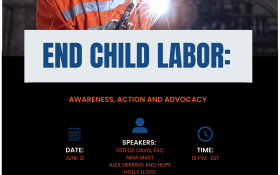 The Alliance To End Human Trafficking is hosting a webinar on child labor in the United States on World Day Against Child Labor on June 12 at 12 p.m. EST. Panelists Estelle Davis, Esq., assistant director of the Bureau of Refugee Services, Human Trafficking Response, Nina Mast with the Economic Policy Institute and Child Labor Trafficking Survivor Advocates Alex Herring and Hope Holly Lloyd will share their stories, expertise and solutions on this atrocity that not only happens abroad but in our communities.