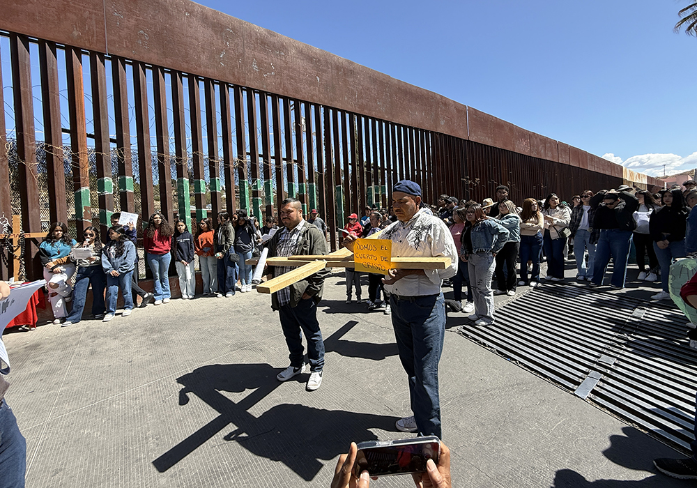 About 80 people showed up April 5 for the Via Crucis, or Way of the Cross, procession that flowed through the city street running parallel to the border wall in Nogales, Mexico, accompanied by local police and an ambulance for 2.5 miles over nearly three hours. A trio of musicians on a platform trailer pulled by a truck provided the soundtrack.
