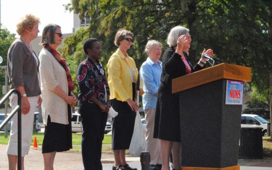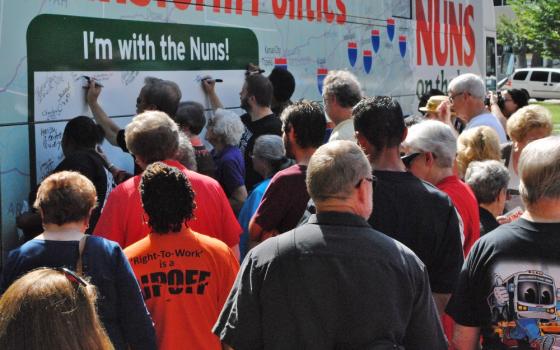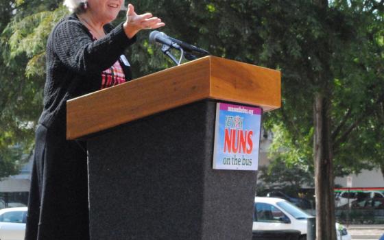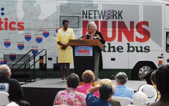 As Social Service Sr. Simone Campbell and the Nuns on the Bus tour bus rolled onto St. Louis' Kiener Plaza on Thursday, a crowd of about 70 people — many women religious — began to cheer. The cheers continued as Campbell emerged from the bus to kick off the 2015 tour, the latest iteration of what has become Campbell's annual tradition of traveling the country talking to people.