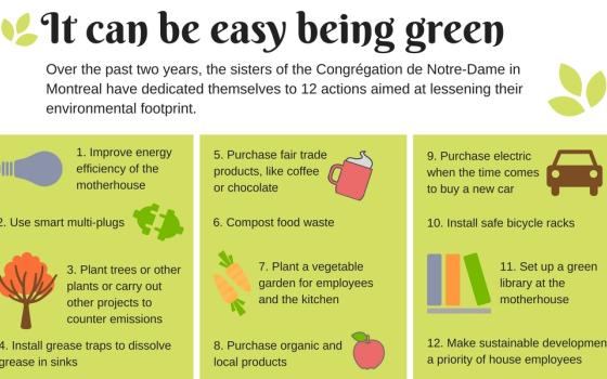 Under the inspiration of their foundress, Marguerite Bourgeoys, and buoyed by Pope Francis' encyclical "Laudato Si', on Care for Our Common Home," the sisters decided to undertake 12 actions aimed at lessening their environmental footprint. They launched a green committee in 2015 and have since introduced fair-trade purchasing, decided on a new environmentally friendly heating and air system, and, among other things, continued to educate themselves and others about green initiatives.