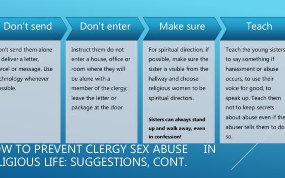 The presentation, which is applicable for communities and congregations in other countries, includes sections about "grooming" of victims and role-playing exercises for sisters to practice rebuffing advances and reporting cases to their superiors. It was created with the assistance of Sr. Kathleen Bryant, a Religious Sister of Charity who served as the vocation director of the Archdiocese of Los Angeles for 21 years and has been a leader in working against human trafficking for 18 years, and Immaculate Heart of Mary Sr. Suzanne Mayer, director of Pastoral Clinical Mental Health Counseling at Neumann University in Aston, Pennsylvania.