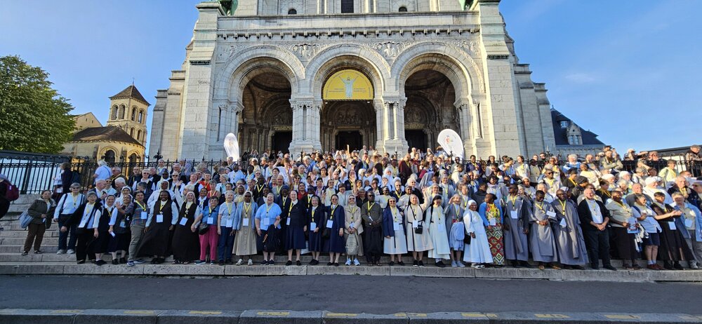 Participants of the National Jubilee of Consecrated Life stand in front of the famed Sacré-Coeur, or Basilica of the Sacred Heart at the top of Paris' Montmartre hill Sept. 6, 2025. Spread between iconic churches of the City of Lights, such as Notre Dame Cathedral, St. Eustache and St. Sulpice, over 800 religious men and women, and members of institutes of consecrated lay people, gathered in Paris Sept. 6-7, for a National Jubilee of Consecrated Life. (OSV News/Courtesy of CORREF/Sophie Nouaille)