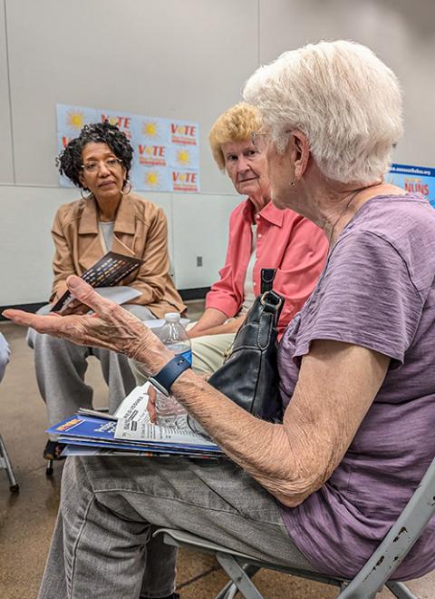 Bus riders Lisa Sharon Harper of Freedom Road (left), and Sr. Richelle Friedman (center), a member of the Sisters of Charity of the Blessed Virgin Mary, listen to a Las Vegas resident's concerns at the bus tour's Town Hall to Vote Our Future in Las Vegas Oct. 14. (Alecia Westmorland)
