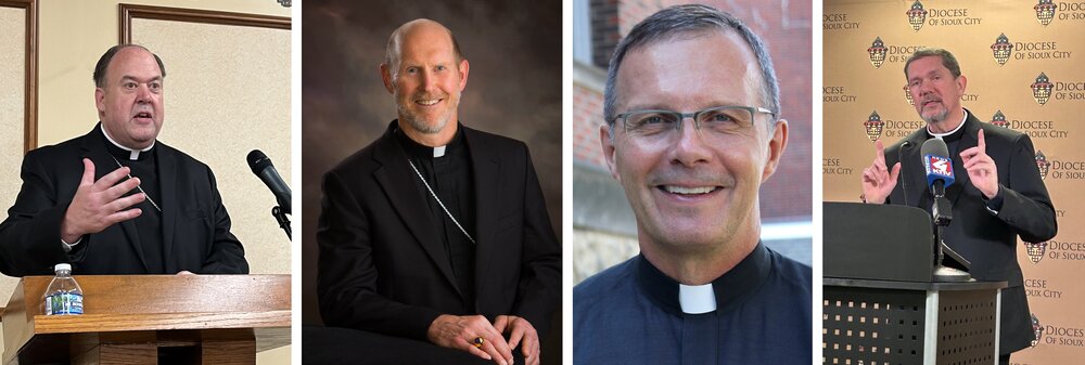 A combination photo shows Bishop Dennis Walsh of Davenport, Iowa; Archbishop Thomas Zinkula of Dubuque, Iowa; Bishop William Joensen of Des Moines, Iowa; and Bishop John Keehner Jr. of Sioux City, Iowa. The Iowa bishops' released a joint pastoral reflection on immigration Aug. 22, 2025. (OSV News/The Catholic Messenger, Archdiocese of Dubuque, Diocese of Sioux City, Lindsay Steele)