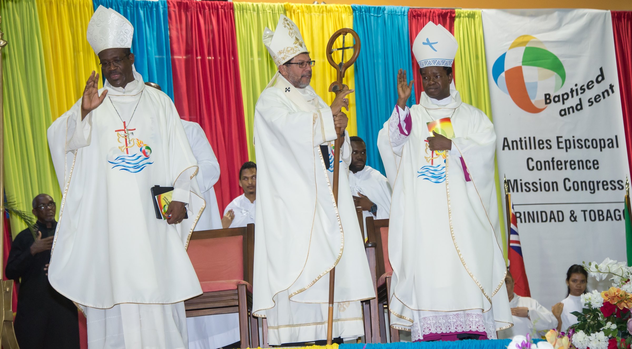 Church leaders give blessings at the end of Mass in Port-of-Spain, Trinidad, Sept. 22, 2019. Pictured from left are Bishop Gabriel Malzaire of Roseau, Dominica; Archbishop Jason Gordon of Port-of-Spain; and Archbishop Fortunatus Nwachukwu. (OSV News/Catholic Media Services/Catholic News, Trinidad/Elmo Griffith)