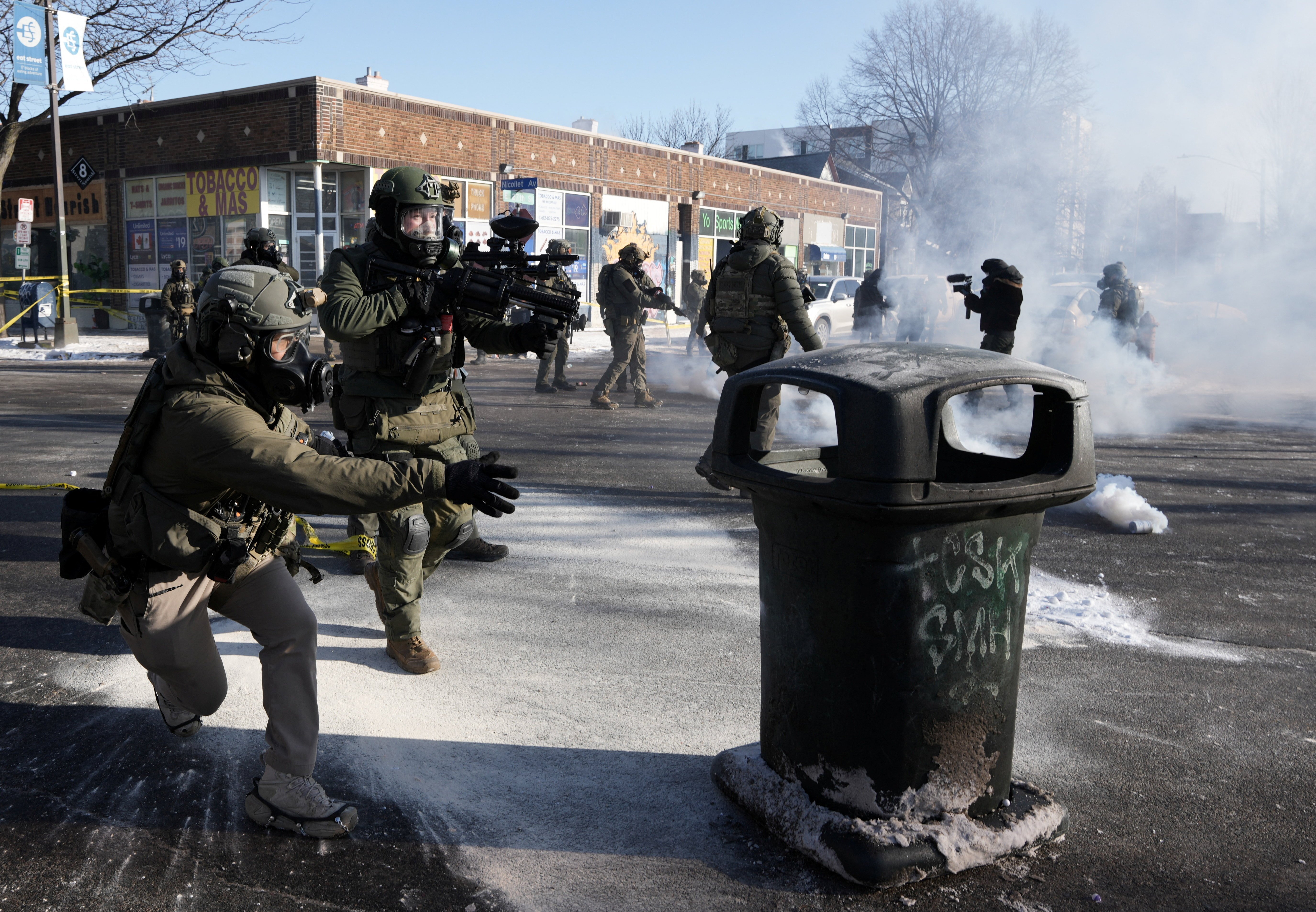 Federal agents during clashes with community members at the scene of a fatal shooting involving federal immigration agents in Minneapolis Jan. 24, 2026. The Department of Homeland Security said the man had a handgun and approached Border Patrol officers during a targeted operation. (OSV News/Reuters/Tim Evans)