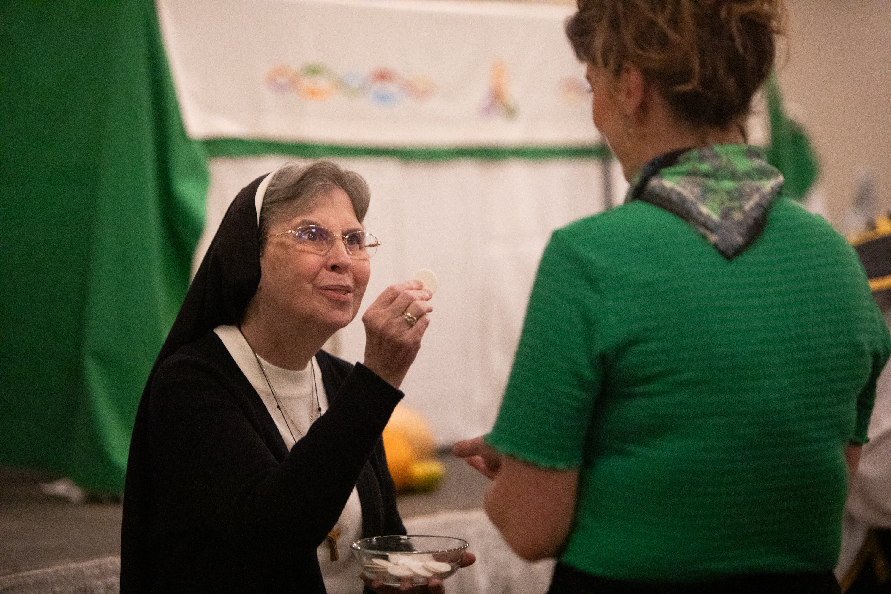 Franciscan Sr. Therese Ann Quigney distributes Communion during Mass at Chicago Gaelic Park following the 2025 International Famine Commemoration in Oak Forest Nov. 2, 2025. Catholics in Chicago remembered the Irish famine that left more than 1 million people dead and began the mass exodus of Irish refugees and migrants seeking a better life to the United States and other countries 180 years ago. (OSV News/Hailey Hoffman)