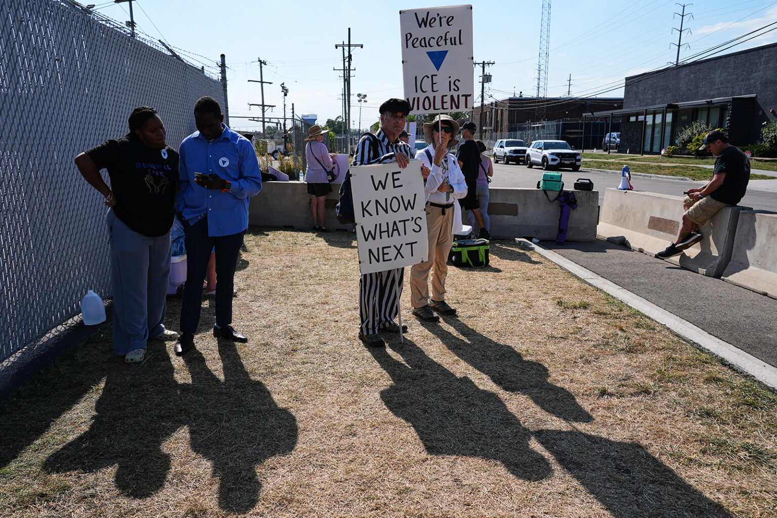 "The idea that we have funders is ludicrous," Black said in a text message.According to activists and footage taken outside the facility by independent journalists at Unraveled Press and others, Noem gave her speech around the time clergy and a large group of Jewish demonstrators, most of whom had spent the morning singing religious songs, were assembled outside the facility. Photographs and video clips show Jewish protesters, some affiliated with the left-wing group IfNotNow, standing under a banner that read "God's love knows no borders" and wearing tallits, or prayer shawls. Later, as ICE vehicles were driven near the protesters, Jewish demonstrators were among those shoved by local police as they stood along the side of the road and, in some cases, attempted to block the cars, video footage shows.Singing with the Jewish group near the Broadview facility that day was Adam Gottlieb, a cantorial soloist at Tzedek Chicago, a local Jewish congregation. They have participated in several protests outside the Broadview facility, including one instance last month when Gottlieb was with other musicians as they were struck by non-lethal munitions. The projectiles, Gottlieb said, left a hole in a guitar.