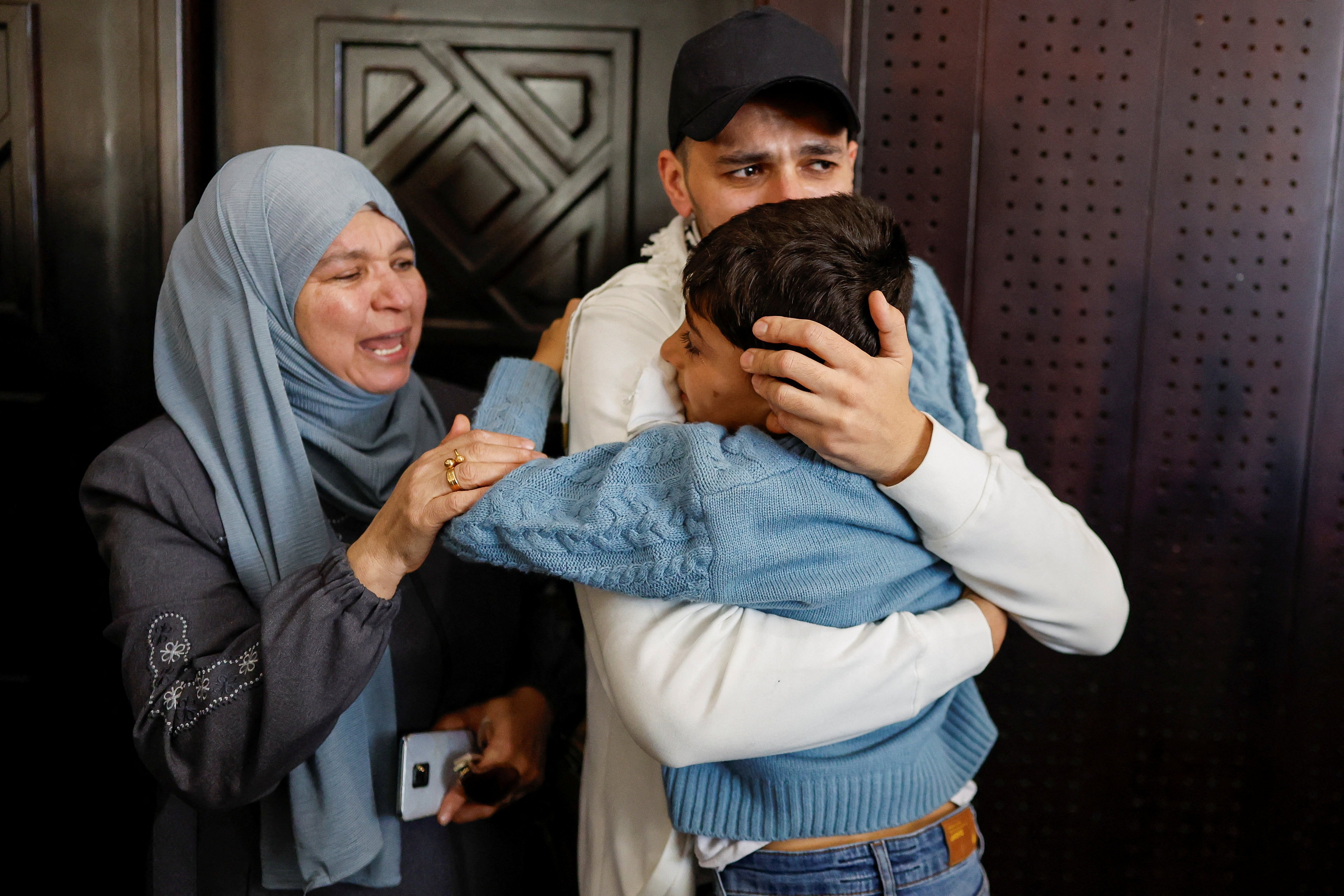 A freed Palestinian prisoner is greeted by his family member in Ramallah, in the Israeli-occupied West Bank, Oct. 13, 2025, after being released from an Israeli jail as part of a hostages-prisoners swap and a ceasefire deal in Gaza between Hamas and Israel. (OSV News/Reuters/Ammar Awad)