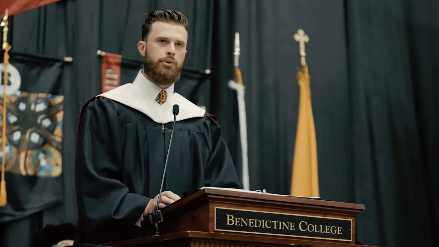 Kansas City Chiefs’ kicker Harrison Butker delivers the Benedictine College commencement address on May 11, 2024, in Atchison, Kan. (Video screen grab)