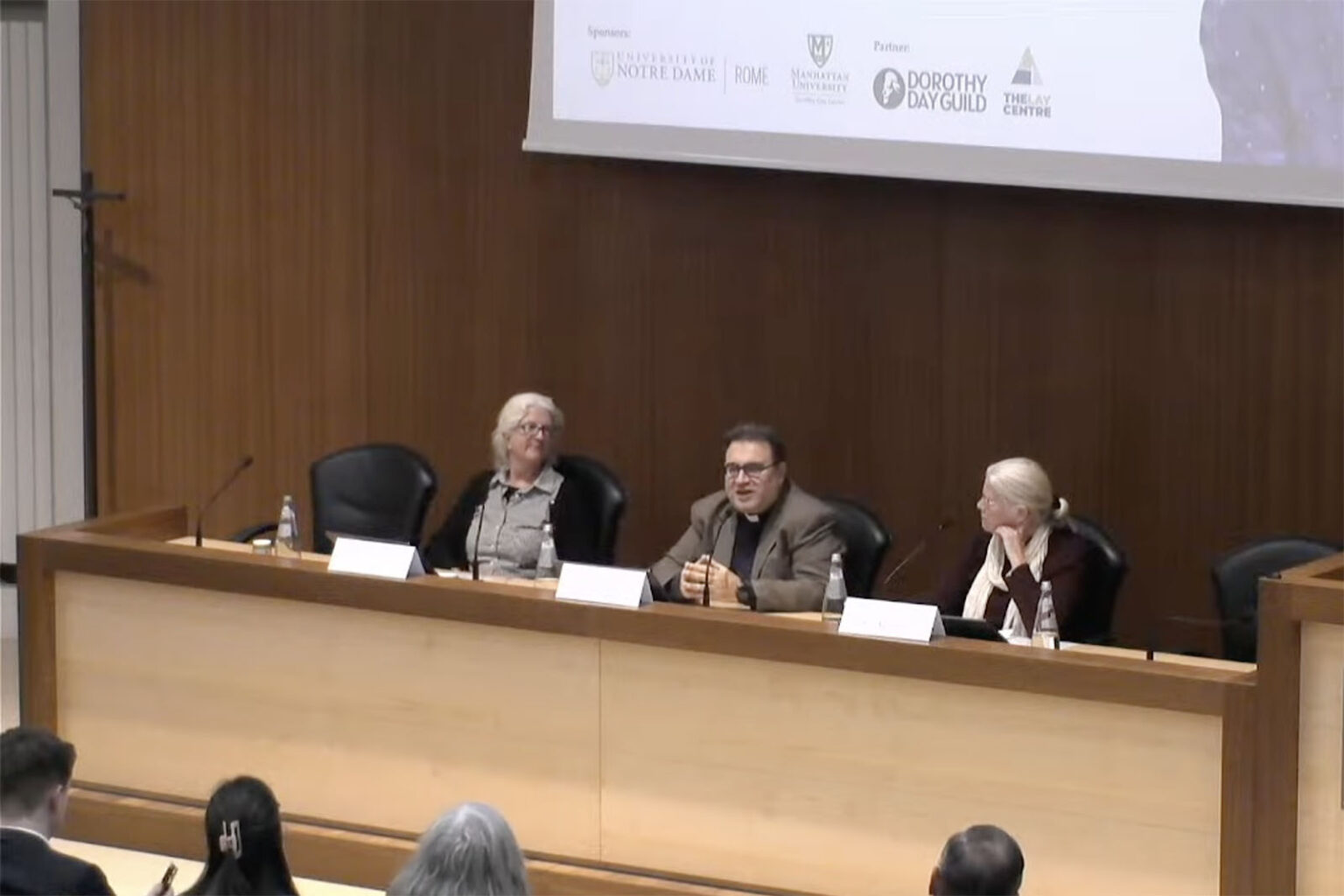Dorothy Day’s grandchildren Martha Hennessy, left, and Kate Hennessy, right, participate in the Vatican-hosted symposium titled “A Pilgrim of Hope: An Academic Symposium on the Legacy of Dorothy Day,” on Nov. 26, 2025, in Rome. (Video screen grab)