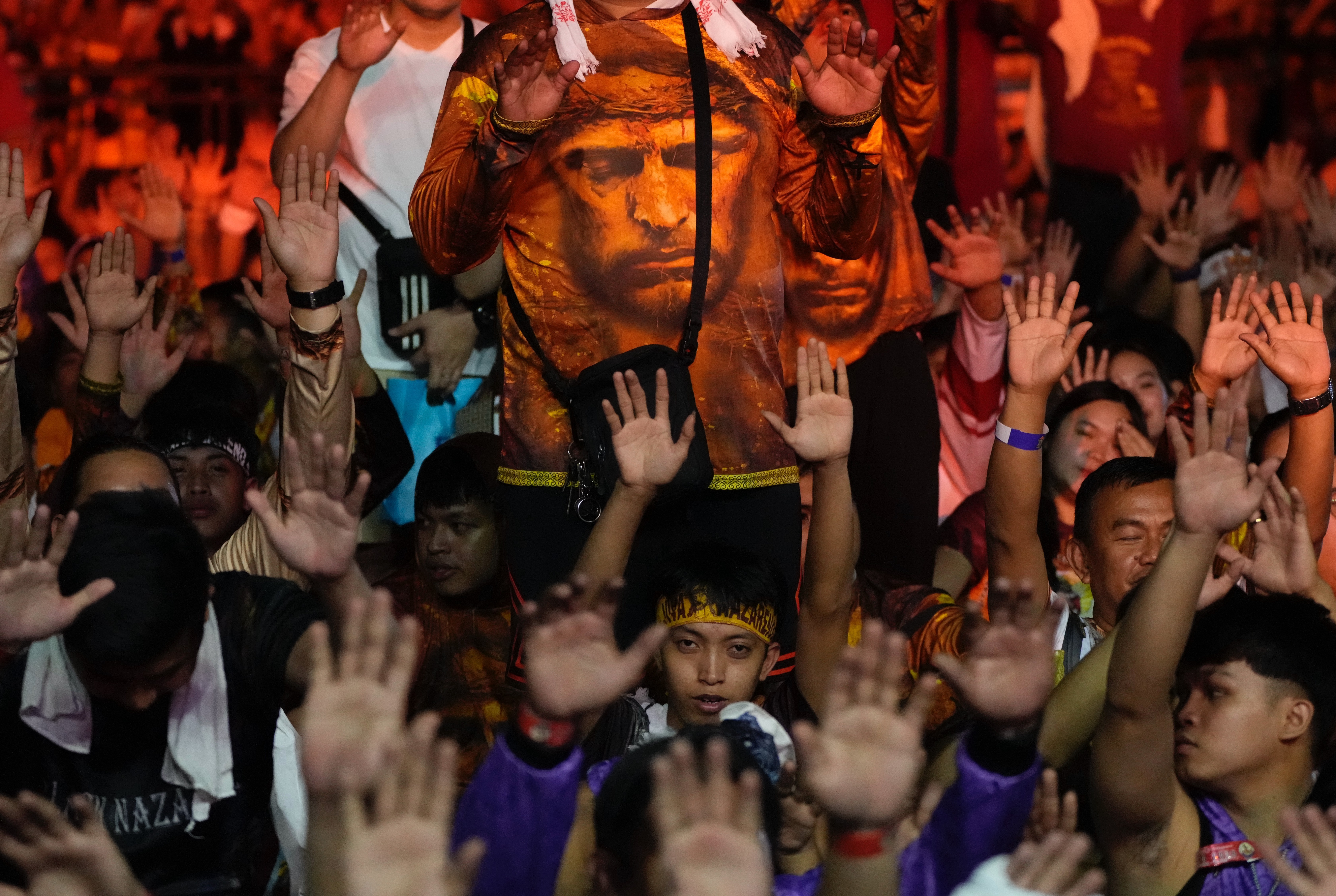 Catholic devotees raise their hands as a carriage carrying the image of Jesus Nazareno passes by during its annual procession in Manila, Philippines, on its feast day Friday Jan. 9, 2026. (AP/Aaron Favila)