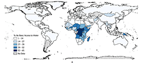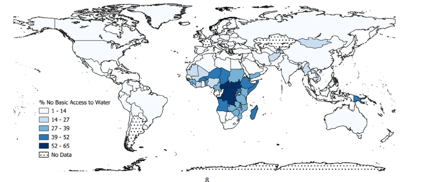 Click the infographic to view a map of the percentage of the population lacking basic access to drinking water in 2022. (Source: 2025 Fordham Pope Francis Global Poverty Report)