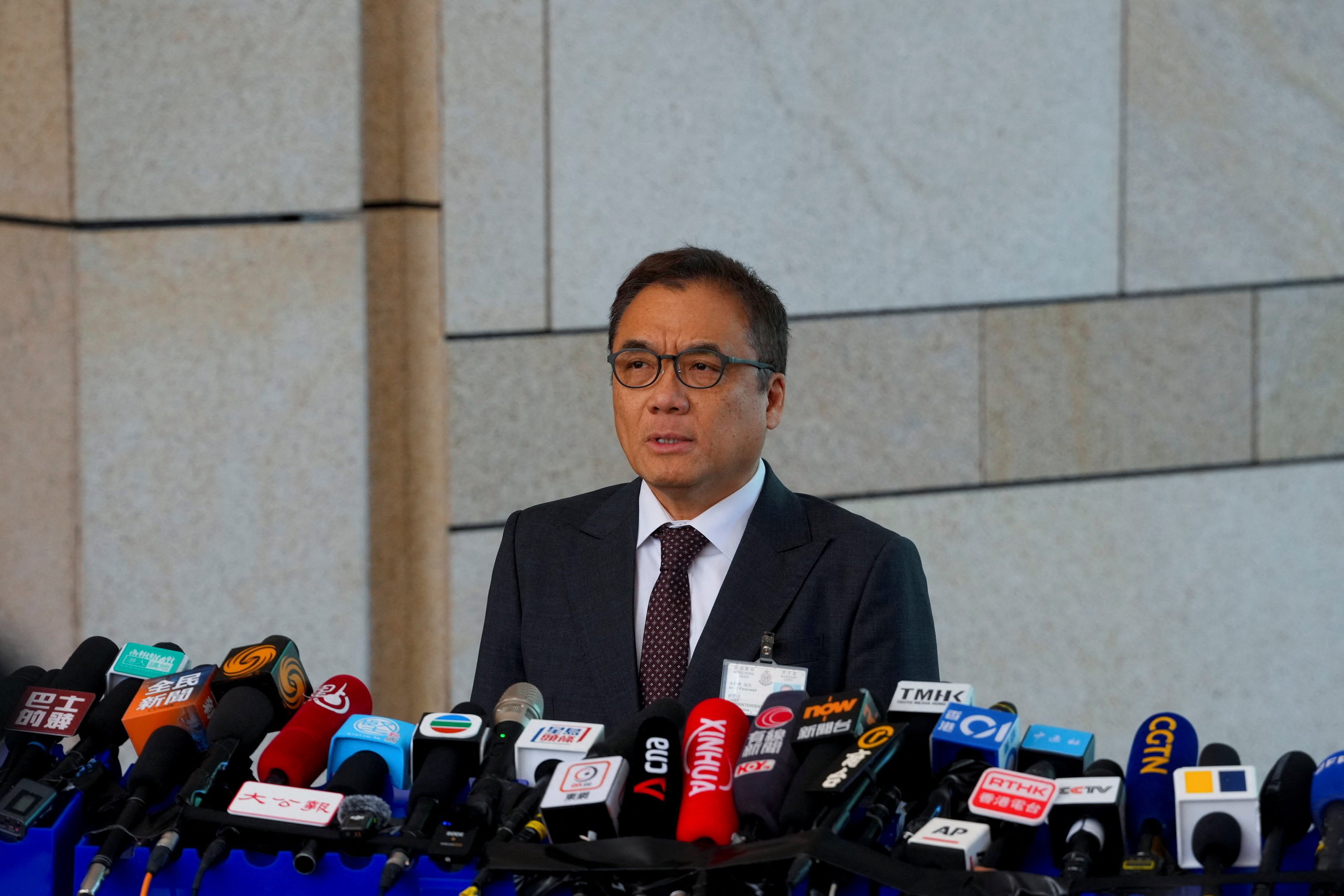 Chief Superintendent of the police force's National Security Department Steve Li Kwai-wah speaks at the West Kowloon Magistrates' Courts building after the verdict in trial of Jimmy Lai, a prominent Hong Kong Catholic, philanthropist and media mogul. Three government-vetted judges found Lai, 78, guilty of conspiring with others to collude with foreign forces to endanger national security and conspiracy to publish seditious articles. He pleaded not guilty to all charges.(OSV News/Reuters/Lam Yik)
