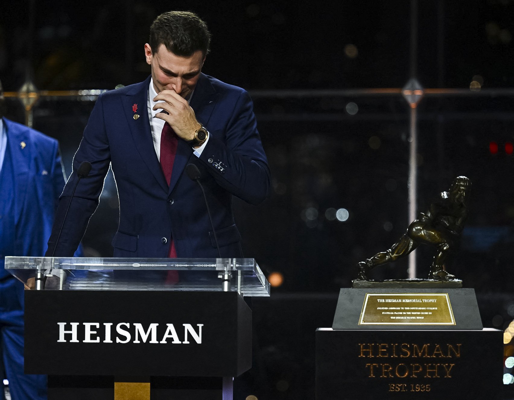 Fernando Mendoza, quarterback for the Indiana Hoosiers, becomes emotional after winning the Heisman Trophy at Lincoln Center in New York City Dec. 13, 2025. Mendoza, a Catholic who frequently credits his faith in God and Jesus Christ for his success, incorporates daily Mass and Bible studies into his routine and gives glory to God in post-game interviews, as he did in his Heisman acceptance speech. (OSV News/USA TODAY Sports/Reuters/Heisman Trust/Todd Van Emst)