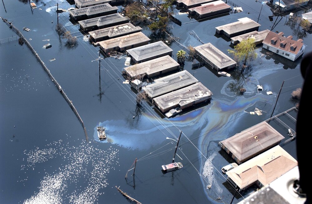 In this Sept. 10, 2005 file photo, homes are surrounded by floodwater and oil slicks in St. Bernard Parish in New Orleans, La. Aug. 29, 2025, marks the 20th anniversary of the deadly storm, which made landfall in the Gulf Coast region, inflicting "staggering" damage and loss of life, particularly in Louisiana and Mississippi. A total of 1,833 were killed. (OSV News/Clarion Herald/Frank Methe)