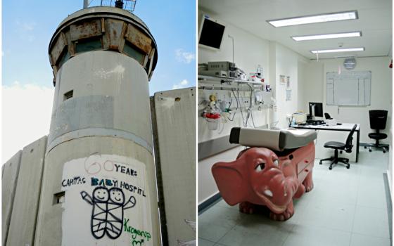 The first sign visitors see for the Caritas Baby Hospital in Bethlehem is spray-painted onto a 30-foot-high concrete guard tower, a particularly imposing part of the separation barrier between Israel and the Palestinian territories that slices through Palestinian neighborhoods.