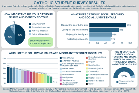 The NCR/Wittcoff Foundation Survey of Young Catholics polled 401 Catholic students in both Catholic and non-Catholic four-year colleges and universities. It was conducted online Oct. 17-25 by Mercury Analytics, a Virginia-based custom research company that regularly surveys the public for organizations including news outlets and nonprofits. The Wittcoff Foundation is a philanthropic group that supports health, education and climate action initiatives.
