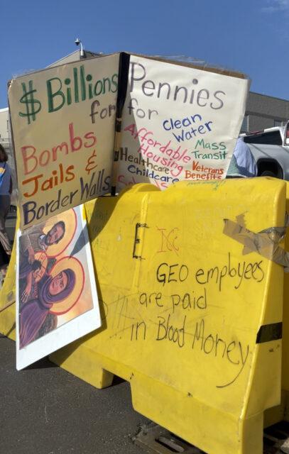 Signs outside the Delaney Hall detention center, Sunday, Aug. 24, 2025, in Newark, N.J. (RNS/Fiona Murphy)