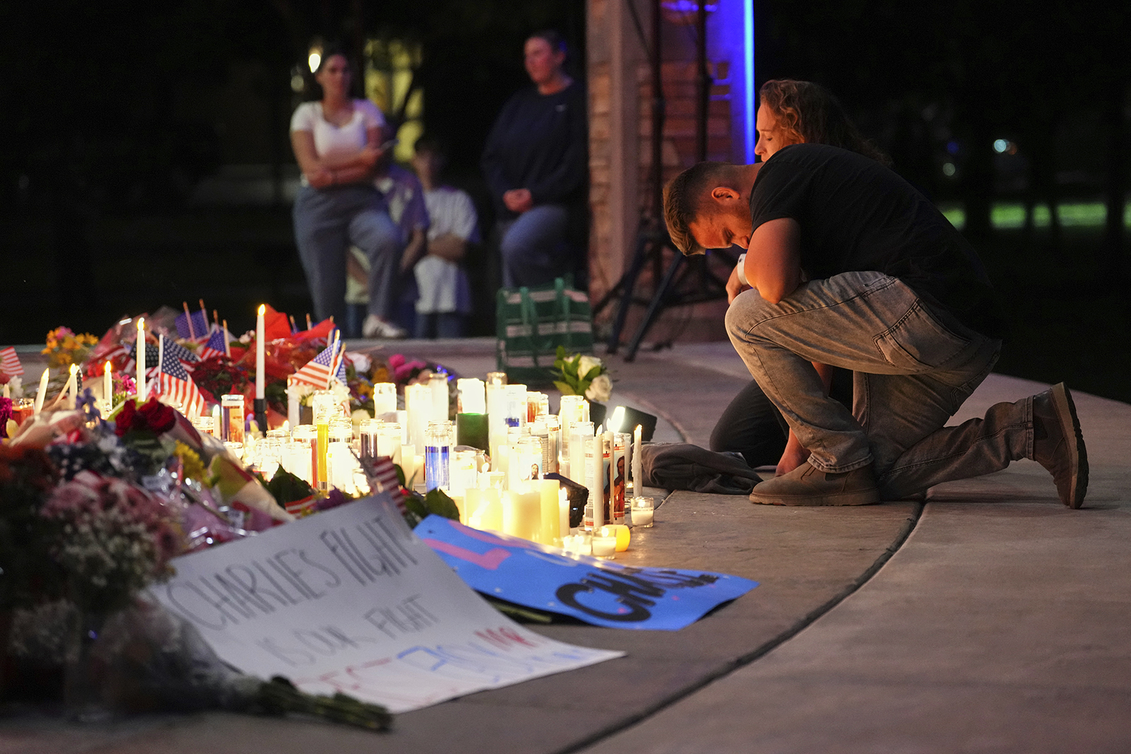 A man kneels during a vigil for Charlie Kirk, Sept. 11, 2025, in Orem, Utah. (AP/Lindsey Wasson)