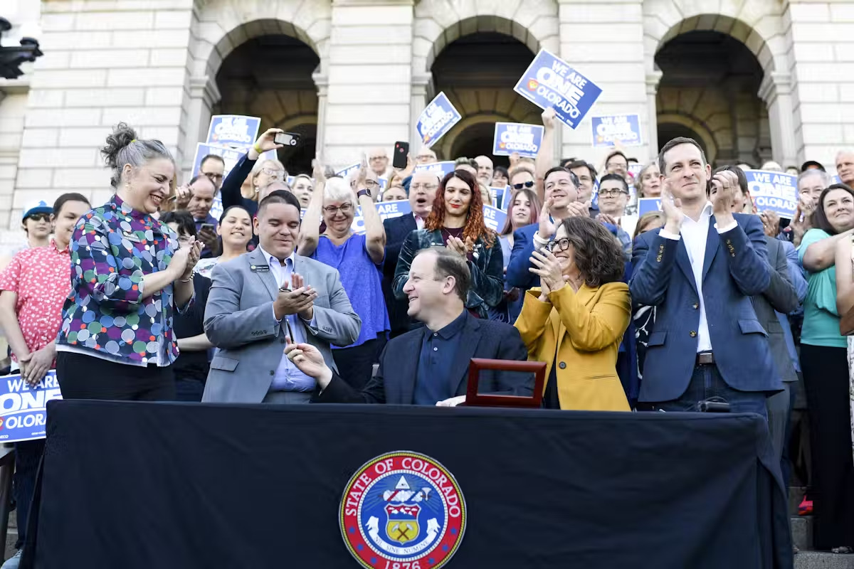 Colorado Gov. Jared Polis is applauded as he signs a law banning the use of conversion therapy on minors. Aaron Ontiveroz/The Denver Post via Getty Images