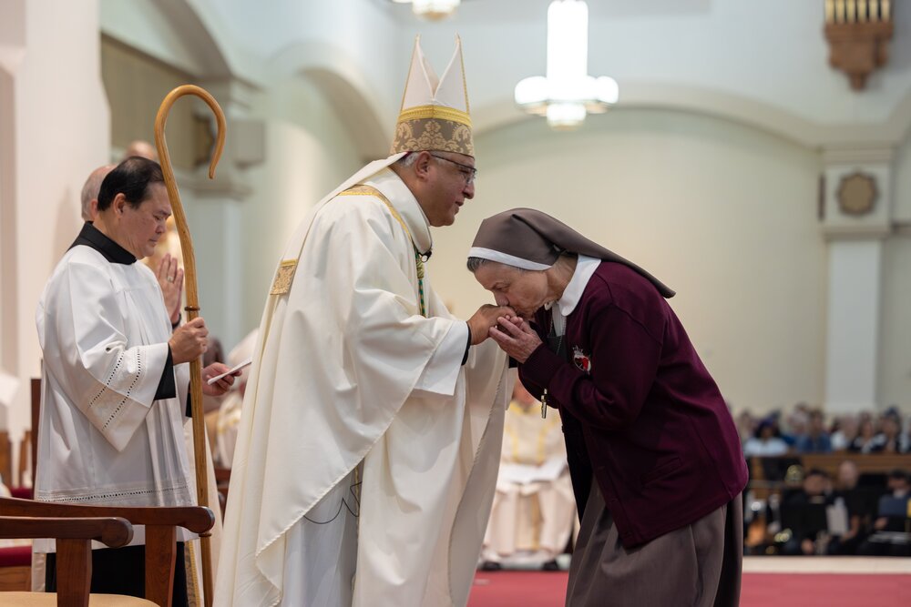 Sr. Silvia Tarafa, a member of the Servants of the Pierced Hearts of Jesus and Mary, greets Bishop Daniel Garcia during his installation Mass as the new head of the Diocese of Austin, at St. William Catholic Church in Round Rock Sept. 18, 2025. (OSV News/Courtesy of the Diocese of Austin/Aaron Smith)