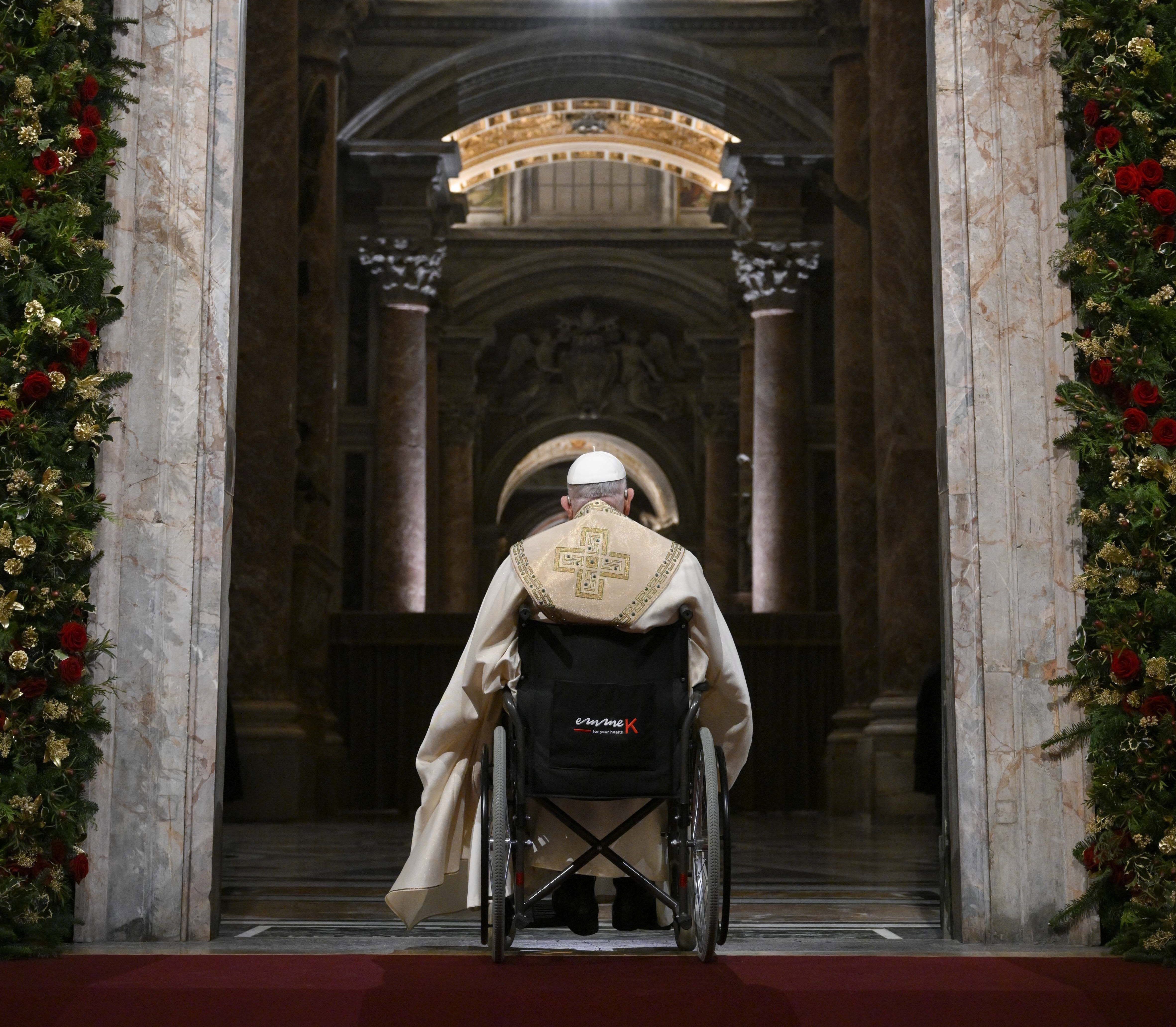 Pope Francis, after knocking on the Holy Door of St. Peter's Basilica in the Vatican on Dec. 24, 2024, waits for his aides to open it as he inaugurates the Holy Year 2025. (CNS/Vatican Media)