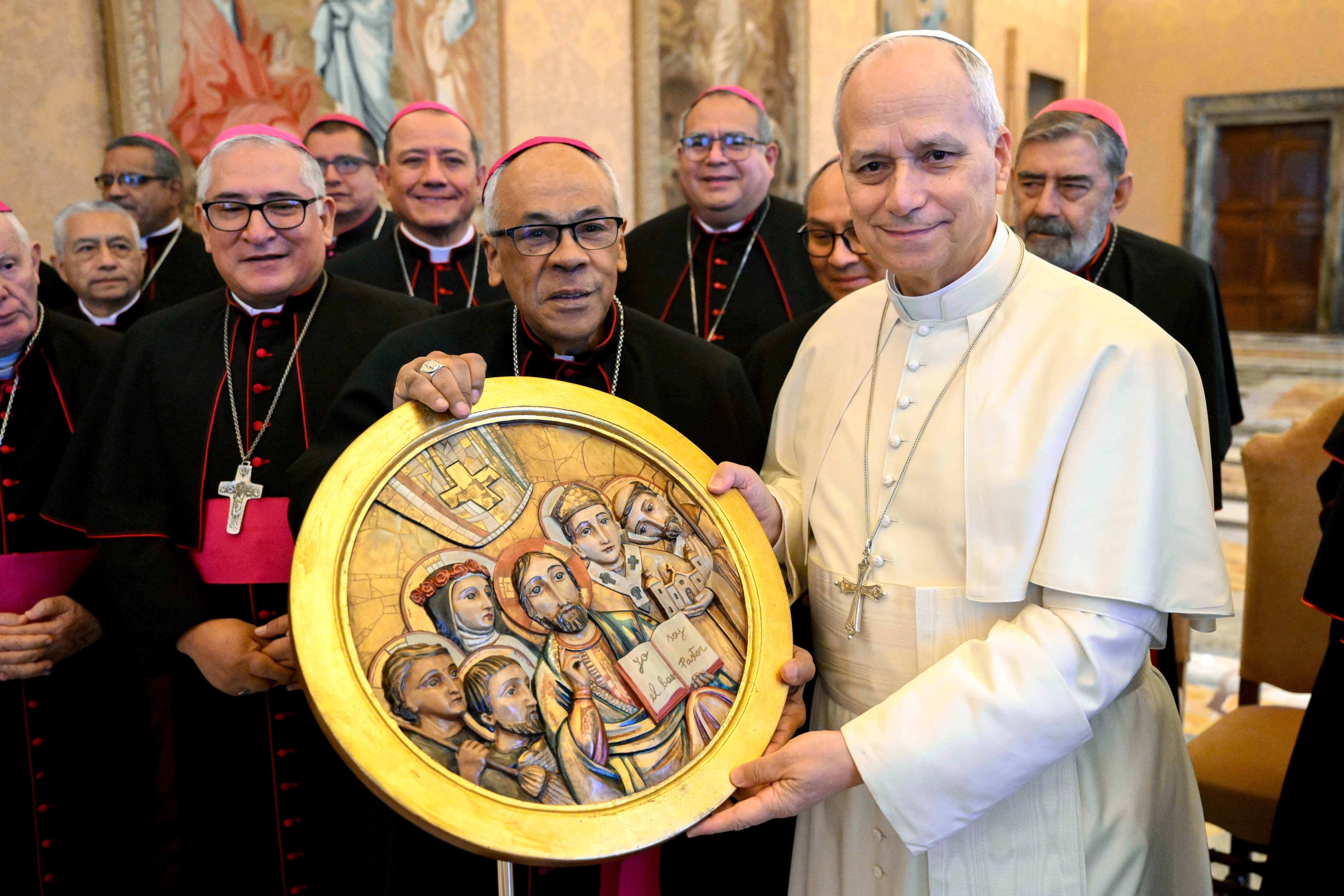 Pope Leo XIV, seen with Peruvian bishops Jan. 30, 2026, holds an image they presented to him that shows Jesus Christ at the center, with St. Rose of Lima, upper left, and other Church figures. The bishops also gave him a mosaic of the Blessed Virgin Mary, which will be blessed and placed in the Vatican Gardens on Jan. 31, Vatican News reported. (CNS/Vatican Media)