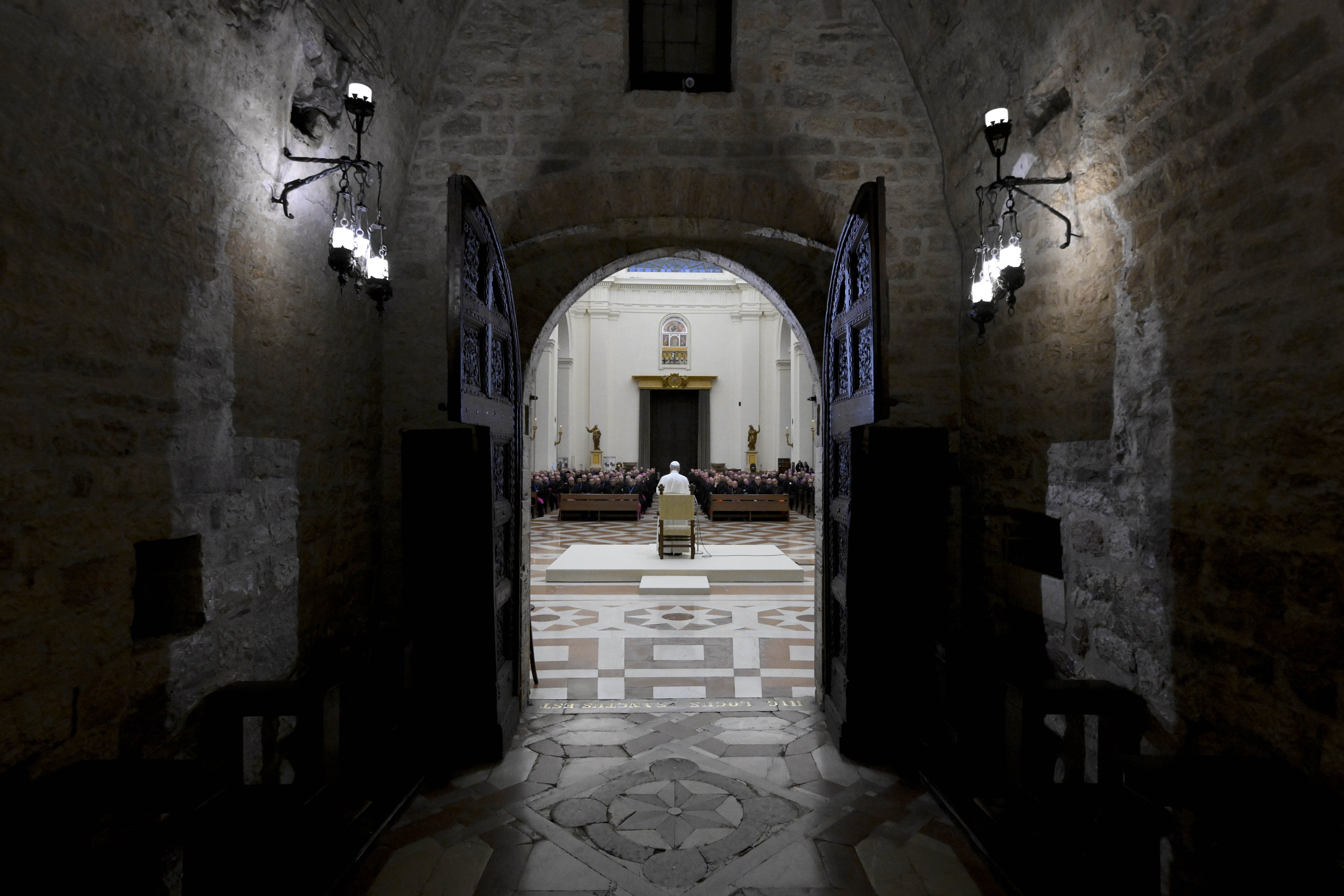 As seen from inside the Porziuncola, the small church where St. Francis founded the Franciscan order, Pope Leo XIV speaks to members of the Italian bishops' conference holding the final session of their fall meeting in the Basilica of St. Mary of the Angels in Assisi, Italy, Nov. 20, 2025. (CNS/Vatican Media)