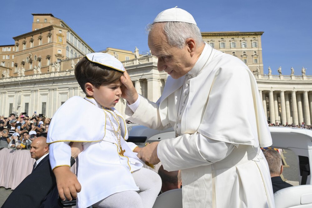 Pope Leo XIV greets a child dressed as the pope as he rides in the popemobile during the weekly general audience in St. Peter's Square at the Vatican Sept. 17, 2025. (CNS/Vatican Media)