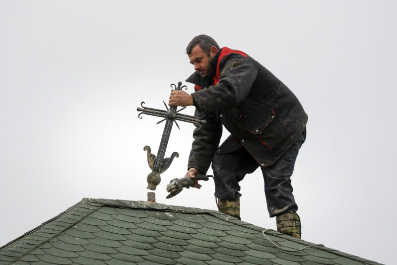 An Armenian man dismantles a cross from the roof of his house in Karmiravan village, as ethnic Armenians leave the the area prior to the Azerbaijani forces being handed control in the separatist region of Nagorno-Karabakh, Thursday, Nov. 19, 2020. (AP/Sergei Grits)